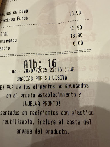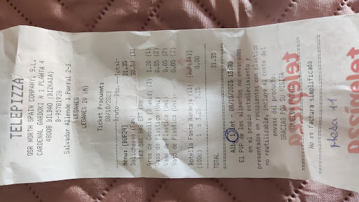 Read moreEl día de hoy nos acercamos a pedir una pizza para comer ahí . mitad peperonni , mitad carbonara . estaba absolutamente llena de aceite y quemadisima . mis hermanos querían comersela por que tenían hambre . pero fue totalmente espantoso. Eramos los únicos en el restaurante y en cuanto hicimos el pedido nos dijeron que tardaban 15 minutos ... Lo cual no fue así por que tardaron mas y nos la llevaron quemadas . sabiendo que estaba así no se dignaron en pedir ni siquiera una disculpa y mucho menos cambiarle o informarnos de lo sucedido y poder esperar la otra . no les importo . anteriormente el servicio de telepizza era bueno . no se que estará pasando . debería de observarlo ya que si no es así . de nada les sirve tener una cadena tan grande. Que decepción . tener que pagar 26 € por una pizza en pésimas condiciones. E incluso pedimos unas alitas las cuales estaban malas. A mi hijo le encanta el pollo y no supo ni como comérselas . totalmente decepcionada . si por lo menos hubiese una...
