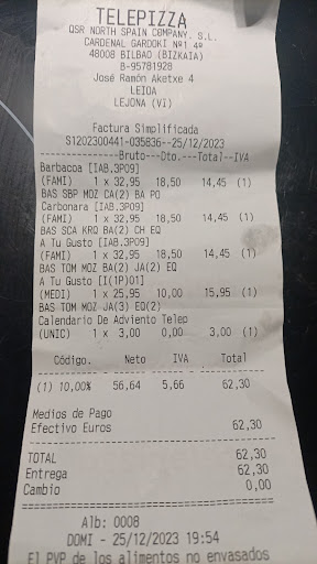 Read moreThe staffs in leioa branch ( telepizza ) are not so approachable to their customers. !!!! You should send or assign them in other branches of telepizza because me my friends and family doesnt like their attitude and treatment to their clients!!!!! You must read all the negative reviews and...