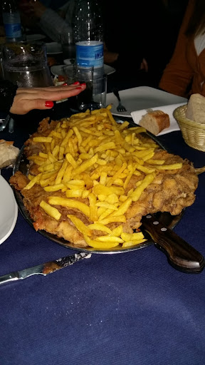 Lo primero que llama la atención es un personal atento, lleno de simpatía y eficaz, con el cual compartirás adorables conversaciones sobre la rivalidad entre las distintas provincias y localidades. Tras ello llega el turno del papeo, el cual coinsistió (en nuestro caso) en un escalope (llamado “cachopo” en otras tierras) del tamaño de la silla sobre la que descansaban nuestras nobles posaderas. Dicha obra de arte es tierna, jugosa y sabrosa a más no poder, y viene coronada por una capa de patatas fritas (caseras y bien elaboradas, por supuesto) de un espesor que, imagino, será al menos parecido al del permafrost siberiano.