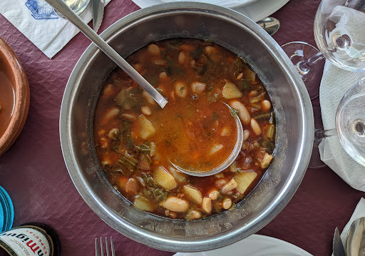 Ahora bien, veo a gente puntuando bajo porque el menú de fin de semana son 25 euros. Vamos a ver princesas exquisitas.. no comeréis en vuestra vida un pote como el que comí hoy aquí yo y mira que he ido a más de 30 restaurantes por Asturias a comer pote y fabada y soy de la Cuenca minera y mi bisabuela hacia un pote y fabada que ya quisieran muchos y sé cuándo un pote está ESPECTACULAR. Luego en muchos sitios en la carta el pote o fabada están a 16 euros y son mediocres. Me vais a decir a mi que por 25 euros el menú de findes a poder elegir 4 primeros, 4 segundos que están de muerte, postre casero y bebida ¿eso es caro? De verdad que con la que está cayendo con la inflación la subida de precios de los alimentos y un largo etc. es un precio acordé con la calidad de la comida.