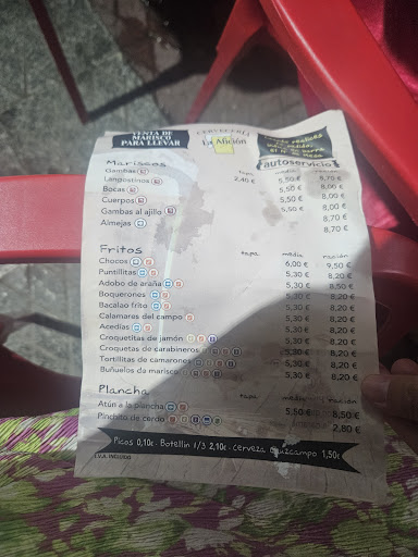 Read moreEstuvimos comiendo mi pareja y yo. Pedimos una media de croquetas de jamón, algo de lo que debería haberme abstenido al ver como la camarera me traia croquetas congeladas y a un precio de 4 euros. SÍ, 4 EUROS POR CROQUETAS CONGELADAS. Me indigna muchísimo ya que al menos deberían decirme que las croquetas son congeladas cuando las fui a pedir y yo decidir si realmente las quiero o no. Luego pedimos un montadito de lomo, que decir de el... Solo un montadito "pelao y mondao" sin patatas (aunque fuesen de paquete), ni ensalada, ni unas simples rodajas de tomate, no sé algo... En fin... Sin mas comentarios. Luego pedimos un adobo, de araña obviamente nos lo puso, tampoco ya tenia las expectativas muy altas después de ver semejante "comida" si se le puede llamar así, que nos pusieron. Sin mucho sabor. Por último y por lo unico que merece un poco la pena comer alli son unas croquetas de carabineros que pedimos. Eran caseras y estaban bastante buenas. Si tuviera que ponerle una puntuación del 1 al 10 mi puntuación sería de 1. No volveré a ir. Y no me vale la excusa de "es que esta cerca de la playa y blablabla", es asqueroso. He comido en el mismo paseo marítimo y he comido por el mismo precio y sin punto de comparación absoluta. Lo dicho, no lo recomiendo en absoluto y no...