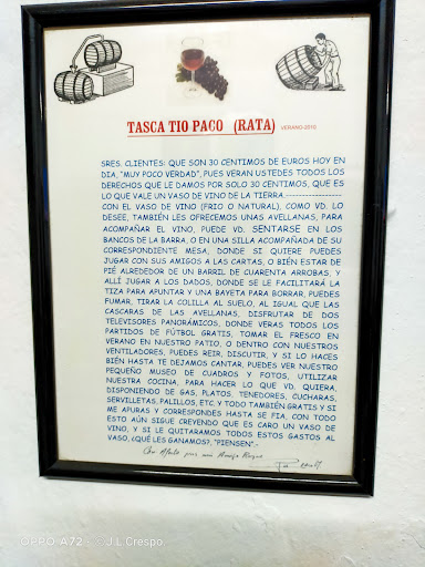 Tipica taverna di Lepe dove si beve vino locale ed economico . Tanti pensionati del luogo si ritrovano qui per due chiacchiere ed un bicchiere di vino. Non somministrano cibo perché ognuno può venire qui con il proprio cibo, usufruire dell' attrezzatura di cucina e del barbecue, passare del tempo con amici o famiglia. Personale gentilissimo. Assolutamente consigliato, soprattutto se si vuole fare un'...