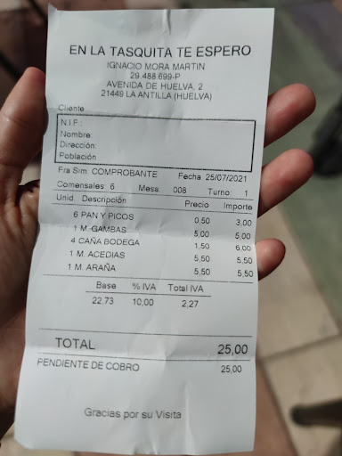 A todo ello, los precios de las cartas no se corresponden con los que son en realidad. Sólo nos avisaron de que el precio de la araña era superior pero no el de las acedías ni el de las cervezas. Pedimos unas cañas (1,20 euros en la carta) y nos cobraron 1,50 euros sin previo aviso. Ante esta situación, pedimos que no marcharan las coquinas.