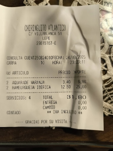 Hoy, domingo 24 de agosto de 2025, fuimos mi pareja y yo a cenar al Chiringuito Atlántico, un lugar al que suelo acudir cada verano. En otras ocasiones he pedido la Hamburguesa Ibérica, siempre servida con patatas fritas, pero esta vez la experiencia fue muy diferente… y para mal.