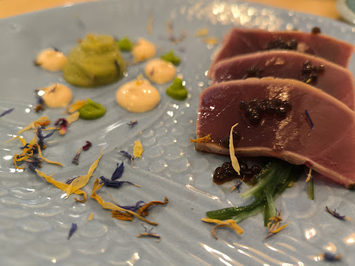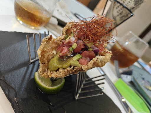 Read moreLocal precioso, con todo cuidado al detalle. Platos deliciosos y con una presentación espectacular, tanto la vajilla como el emplatado Las bravas bravisimas hacen honor a su nombre, picantitas y tiernas. Los gyozas riquísimos. Relleno de textura suave y sabroso. El taco en tortillita de camarones muy rico, buena mezcla de sabores. Los langostinos al ajillos...los mejores que hemos probado. Sabrosos, con su ajito muy picado, de carne tersa. Recomiendo "rascar" en el fondo del plato al cogerlos. Y el tataki.....PURO ESPECTÁCULO!! para repetir sin parar. La combinación de las elaboraciones que lleva el plato es brutal. Pande semillas muy rico también ( no es lo normal de la zona) Estamos...