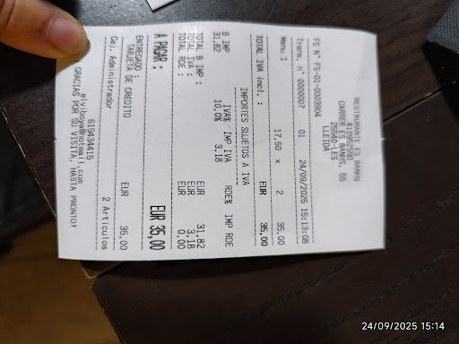 Hoy voy a explicar mi experiencia con pocas palabras, llegamos al restaurante a las 16:00 del jueves, después de varias intentos al fin llegue al Es Banhs, solo sentarme el camarero( un chico muy amable) nos preguntó si queríamos tomar algo y yo le dije ''no, habíamos pensado en comer algo'' su respuesta ''sin ningún problema'' nos trajo la carta y pedimos unos entrantes, a continuación pedimos un plato principal, la mayoría escogimos carne del país hecha a la brasa, la cual estaba muy rica, la verdad que tienen bastante variedad de platos y en definitiva refiriéndonos a calidad de lo mejor que hay por la zona. En definitiva, un sitio recomendable 100%, lleguéis a la hora que lleguéis y si tenéis la misma experiencia que nosotros no saldréis decepcionados. Pero al loro, lo mejor de todo, al acabar de comer nos invitaron a unos chupitos de Cassis (licor casero y típico de la zona) y nos dejaron la botella en la mesa, en plan, serviros 🤷🏼♂️. Felicidades a est@s señor@s por el servicio que...
