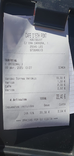 Jueves día 27/07/23 pare en Les para comer, por tener una terraza cubierta junto al río, escoji el resturante "Cafe D'eth Pont. Entrante plato de pan con tomate y jamón iberico, el pan era bueno y estaba bien preparado, el jamón tenía unas lonchas con su color de recién cortado y otras color blanquecinas lo que indicaba que hacia días que no se cortaba. Luego una racion de mejillones que daban como frescos desde no se que día, las conchas estaban jucias, sin cortar los hilos y como deshidratados lo que indicaba que estaban descongelados más de un día, probamos dos y daban asco. Avise para que se los llevaran indicando que no eran frescos. La camarera, que parecia la dueña me indico que yo no sabia lo que era el marisco fresco, yo le conteste que no tenia ganas de discutir y que pagaria la cuenta, que me trajera la paella pero para llevármela. En estas apareció el marido de malas maneras y sin saber lo que es la educacion. Le repeti traigame la paella para llevar y la cuenta. El restaurante vi que estaba calificado con tres estrellas yo les pondria una. Y desde luego no lo aconsejo ni por la comida ni...