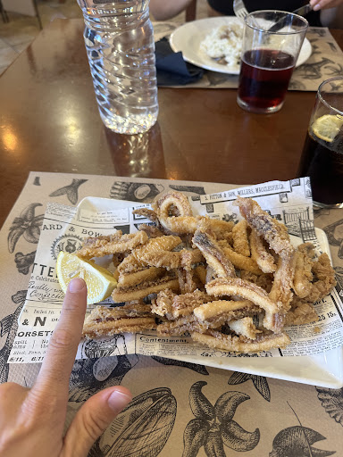 Read moreReservamos una paella de marisco para 7 y unos entrantes que elegiríamos mientras se hacía la paella, todo esto reservado por teléfono para las 14:30. Nos sentamos a las 14:15, restaurante llenándose, nos tomó la comanda el que parecía ser encargado. Nos comenta que las raciones de paella son tan abundantes que no pidamos muchos entrantes porque no vamos a poder con ello... Y asegura que mientras nos sacan los entrantes, 10 minicroquetas, tomate y medio con aceite y sal y docena de pimientos verdes, en 15/20 minutos está la paella. Han pasado 45 minutos y le pregunto por la paella y los 20 minutos ya doblados, a lo que me responde aparentemente enfadado que hay mucha gente, comemos pan... Finalmente a los 50 minutos aparece la supuesta super paella de marisco, un langostino y dos mejillones por barba, rellena 7 platos y deja un octavo similar a los anteriores por si queremos repetir. Nos quedamos con hambre, la verdad, la ración que por teléfono era a 15€ por persona se cobra a 16. La ración de pan a un euro por persona.