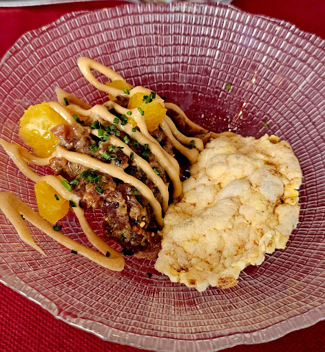 Cremós de bacallà i ceps amb ceba confitada.... fantàsticament elaborat i presentat, detalls al paladar de tota la mixtura que no us deixarà indiferents. Bona barreja de mar i muntanya.
