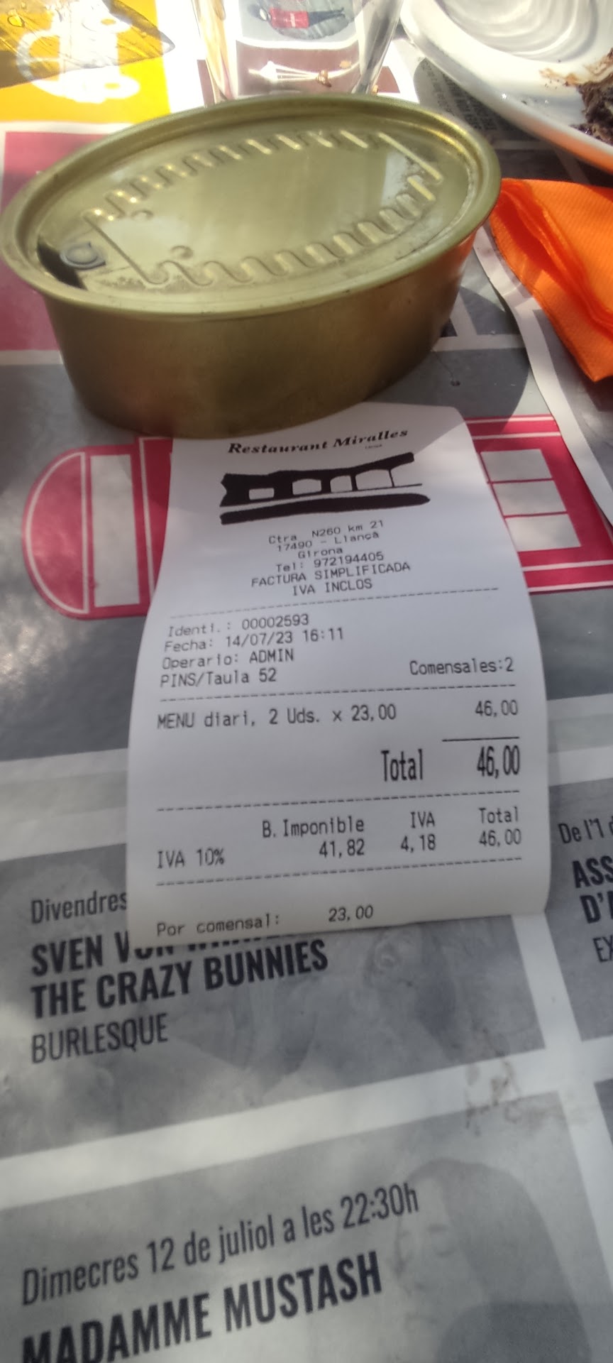 Gracias por regalarnos un pan que no era del día ni mucho menos y estaba duro y seco.Por cierto que es lo caro del alioli ? La leche o el ajo? Nunca lo había pagado a precio de oro…