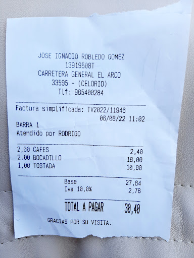 Read moreFui a desayunar con mi hijo y pedimos dos cafés solos y tostadas con aceite y tomate. Eran las 11,00 de la mañana. Nos ponen unas tostadas transparentes y muy pequeñas, cortadas de barra de pan, pero no de pan bueno del Norte, que es denso y bueno, sino de esos precongelados que venden en los chinos. Aparte de no saber a nada, si juntas las tostadas te sale que te has comido un trocito de pan. Bien, pues por ese "desayuno"de cafe y mini tostaditas, nos cobraron 12,40 euros! A 6,20 euros por persona! Por supuesto sin zumo ni nada añadido, ni siquiera esas pastitas que ponen en la taza de café a veces! Menudo robo a mano armada! Para colmo de seguir robando, estaba el dueño preparando unos bocadillos de jamón, que nos quiso vender para el desayuno (ahora váis a entender por qué!..) y le dijimos que mejor nos lo llevabamos pero para la playa. A la hora de cobrar le hizo unas señas a la camarera y nos dió el ticket. Los bocatas, a 9 euros cada uno! O sea, que pagamos por dos desayunos malísimos de cafe y tostada y por dos bocatas (que cuando los abrimos estaban rellenos de más de seis rodajas grandes de tomate y unas pocas laminas transpaentes de jamón rosado, de ese que aún no está bien curado) la cantidad de ¡¡¡ 30,40 eurazos !!! ¡Menudo robo! Menudo sin...