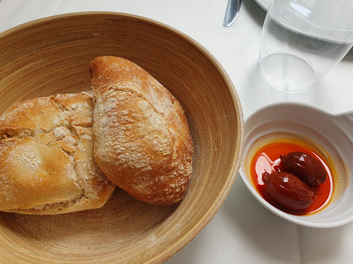 Since I was driving, we just ordered a small bottle of white wine and some sparkling water. Soon we got serve some tasty bread and a small appetizer (Chorizo - which was delicious). Ordered the Lobster rice for two (Arroz Bogavante). It was prepared freshly and there was a bit of waiting time. Usual for this kind of meal. When it arrived it was already impressive by the look. But not only the look - it tasted excellent as well. The lobster was cooked to perfection. Equally impressive was the broth the rice was cooked in. Wonderful, rich seafood broth. That meal was a real treat. Everything we hoped for and more.