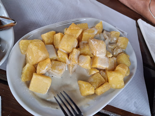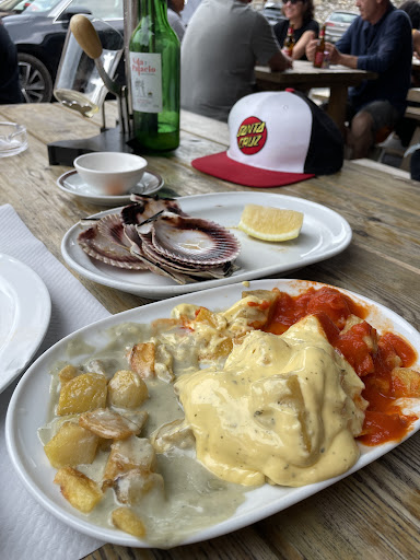 Pedí comida poco después de las 13:30, es decir, de los primeros, con la cocina tranquila y nadie comiendo aún. A pesar de esto, las zamburiñas, aunque ricas, llegaron frías. Y las patatas a las tres salsas, fritas del día anterior y recalentadas en el microondas. Blanduchas y empapadas en demasiada salsa. Una pena, porque la materia prima es claramente buena.