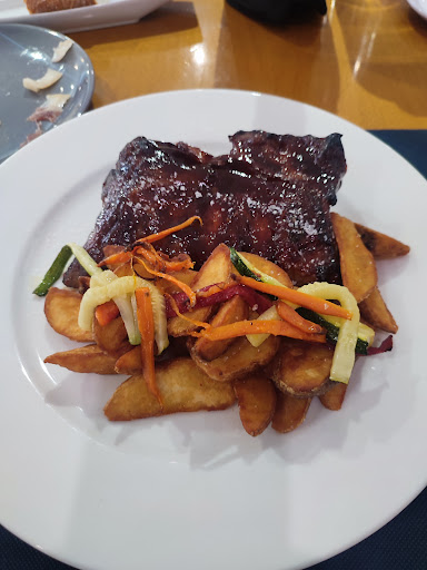 Empecé con una crema de calabaza que era suave, delicada y reconfortante, casi como un abrazo cálido para el paladar. Luego, disfruté de unas costillas de cerdo jugosas y llenas de sabor, un auténtico placer en cada bocado. Para finalizar, el postre fue una fusión exótica y equilibrada: fruta de la pasión con crema de coco y un toque cítrico que combinaba dulzura y frescura, despertando los sentidos con cada cucharada.