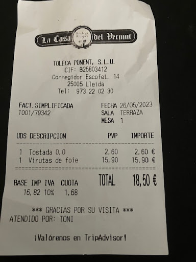 Read moreComida de trabajo de 12 personas. Al llegar, le pregunto al camarero si el sol dará en la mesa en breve, pues ya hacía mucho calor y me contesta, de forma muy poco educada y con prepotencia, que no lo sabe y que igualmente esa es la mesa que nos toca y punto. Habíamos reservado el día anterior, por tanto, podía preparar perfectamente la mesa con antelación. Le pido al camarero la carta y me dice (otra vez de modo poco educado) que tengo que usar el código QR, que no tiene carta en formato papel. Suerte que sé utilizarlo, porque, si no, me quedo sin poder ver la carta. En cuanto a la comida, pinchos a partir de 4 euros, tostadas a precio de menú, ¡2,6 euros una cerveza sin alcohol! Total: unas cráquets con mermelada y un poco de foie rallado, más una cerveza: 18,50 euros. ¡Carísimo! Adjunto foto. Personalmente no volveré ni lo recomiendo. Deberían mejorar el servicio y la atención al cliente. Cuando uno sale a comer fuera, quiere tener una experiencia gratificante, en ningún caso paga para que lo traten así. Como ellos mismos piden en el tique que los valoremos en Tripadvisor, pues aquí dejo mi reseña. Por cierto, he leído unas cuantas y parece ser que no soy la única a la que el camarero no trató...