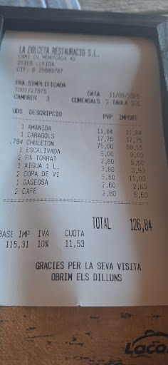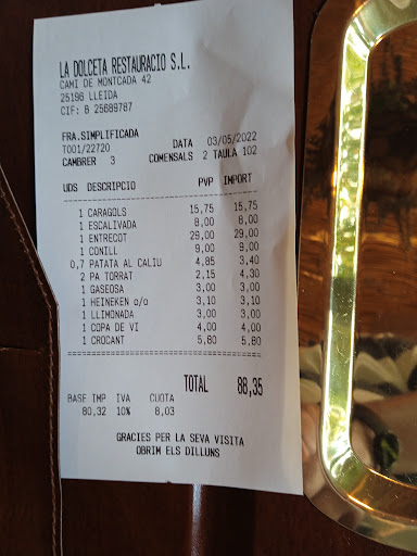 Read moreFuimos a comer porque pasabamos de camino, queriamos comer caracoles y no queriamos entrar en Lleida. Caimos en la tentación de pedir un chuletón para compartir pero aun asi hubiera salido a 50 euros por persona con un primero (caracoles y ensalada de lechuga y tomate) y carne a la brasa de segundo y sin postre, lo que nos parece un precio excesivo. Lo que me pareció un robo fue el vino. Pedimos dos copas de vino que estaba malísimo y nos cobraron 5.50 por copa (las copas grandes y ostentosas pero el vino avinagrado y con mucho sabor a alcohol, estoy segura menos de 10 euros la botella). Le comenté a la camarera que no me gustaba nada y si me lo podían cambiar y solo me ofreció pedir una botella de otro vino más caro (no queríamos botella al tener q conducir). Para poder beberlo pedi gaseosa (que por supuesto tambien me cobraron). Me parece que en un sitio de "tanto caché" y esos precios el vino de la casa no puede estar tan malo. Los cafés solos con hielo a 2.80 (precio que no pagas ni en la rambla de Barcelona), las guarniciones pequeñas y las pagas a parte (9 euros por un platito de escalivada). Para mi un sitio en el que pagad un plus por un ambiente supuestamente elegante en Lleida. La comida estaba buena pero realmente nada original. Si quieres comer bien seguro que hay sitios mas sencillos y con comida igualmente buena en los que pagas la...