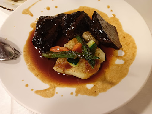 Para comenzar, elegimos el arroz de calamar y pulpitos con azafrán, que sorprendió por su delicado sabor y la cocción perfecta del arroz, impregnado de los sabores del mar y un sutil toque de azafrán. Como plato principal, probamos el rodaballo a la brasa, servido con arroz de azafrán y gambas. La parrilla realzó el sabor del rodaballo de manera excepcional, con una textura jugosa y un toque ahumado delicioso. También disfrutamos el meloso de ternera, acompañado de verduras frescas y una salsa de vino que complementaba de manera magistral cada bocado, aportando profundidad y un toque de sofisticación.
