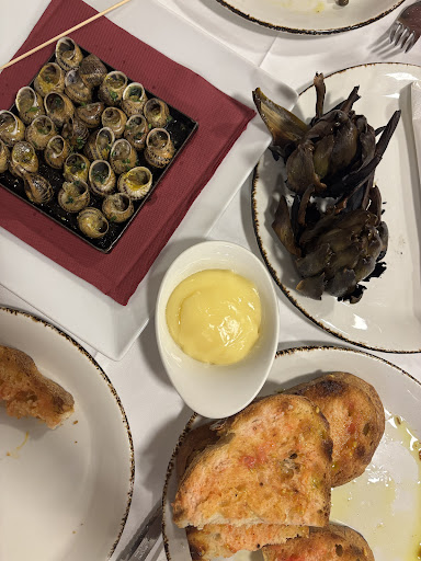 Read moreVeníamos con las expectativas altas debido a los comentarios de google, pero empezamos mal cuando pedimos un vermut, una cerveza y una jarra de agua del grifo y la camarera nos dice que no hay jarra, que tiene que ser botella. Yo no soy hostelera, pero sé que según el artículo 18.3 de la Ley de residuos es OBLIGATORIO que si pides agua del grifo te la pongan. En fin. La camarera un poco intensa…igual hay gente que le gusta que le hagan comentarios continuamente del estilo “uy que serios venís” y cosas que no venían a cuento. Todo sobraba..no nos hacía gracia. Los caracoles sin más. Las alcachofas a 3.10€ la unidad, nada destacable. El rodaballo estaba bien y el entrecot con verduras ok. De postre pedí un brazo gitano y era el bizcocho por fuera y todo el centro relleno de nata :( me esperaba el típico bizcocho enrollado sobre si mismo que queda como un caracol, pero bueno. En general me ha parecido caro para la calidad ofrecida. Correcto pero nada sorprendente. El pan con tomate muy rico! Y carete también jaja Creo que habrá mejores restaurantes en Lleida y a mejor precio, pero siendo Lunes no había...