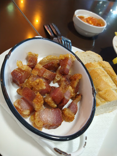 La verdad es que al entrar da buena impresión ver tapas en la barra, lo primero que se ve son un montón de torreznos, calamares a la romana, puntillitas y croquetas. Los torreznos no estaban mal, buena presentación pero tampoco estaban hechos al momento. Los bocadillos que pasaron por delante mientras estábamos allà no tenÃan mala pinta, nosotros pedimos unas patatas bravas y trajeron patatas fritas normales con la salsa a parte, más apropiadas para acompañar una hamburguesa que como tapa... Cosa que no nos convenció mucho. No pedimos ni calamares ni croquetas, ya que visto lo visto lo habrÃan calentado en el microondas y listo. Una lástima por que no tenÃan mala pinta pero el crujiente de un rebozado recién hecho no se puede comparar con unos calamares recalentados en microondas. Por lo demás correcto, limpio, el personal amable y el...