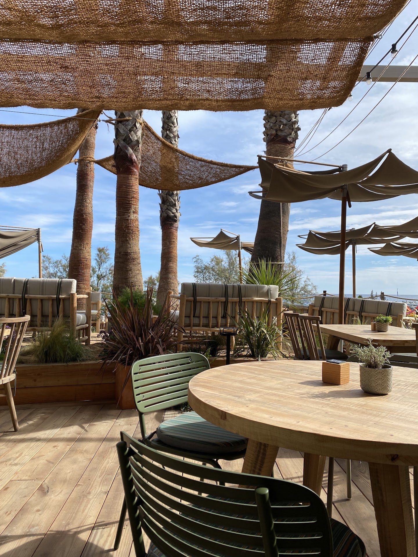 The location is lovely, right by the beach. The outdoor tables are placed in partial shade, though some still get quite a bit of sun. Unfortunately, breakfast is not available.