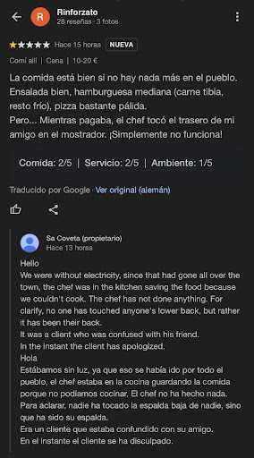 Anoche cenábamos con mi amigo en el restaurante, y se fue la luz durante 1h en todo el pueblo, yo estaba presente en el momento que ocurrió el suceso que explica en el primer comentario de la foto y no es cierto, el chef estaba en la cocina, y un cliente que estaba en el local se fue a aproximar a su amigo y se confundió con la pareja que estaba pagando, porque al estar todo el local a oscuras no se veía nada, en ningún momento le tocaron el “trasero” a la chica que estaba pagando, yo estaba al lado y solo le toco la espalda, pensando que era su amigo, fue una simple confusión y al momento pidió disculpas sobre la situación, hay que tener cuidado sobre lo que ponemos de comentarios hacia los locales, porque pueden afectar bastante, una confusión de un cliente cuando no tenia intenciones malas hacia nadie no tiene que afectar al local, recalco que el cliente se confundió de persona y en ningún momento toco nada de cintura para abajo, solo la espalda. Recomiendo venir al local y probar la estupenda comida y...