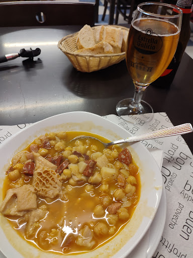 Hemos comido tres días, ya habíamos estado el año pasado en el mes de enero, que comimos un cocido exquisite, el mejor que hemos comido en Ourense La comida muy rica, la atención muy amable y simpáticos. Menú diario, tres primeros y tres segundos y postre a elegir, pan, bebida y café, sábado 13 euros, domindo 15 euros y lunes 12 euros. Súper rico, muy bien cocinado, para mí, es imposible comerlo todo, pero me han dado la opción de poder llevármelo. De nuevo todo de 10. Hemos desayunado también una mañana, café muy bueno, croissant reciente, bocatines variados, de haber esperado un poco, también podría haber pedido tortilla de patata, que tenía una pinta...