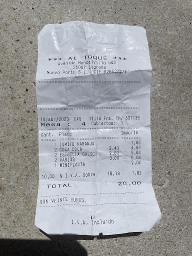 Read moreEl bar está limpio, no voy a mentir, pero las chicas... 🤦🤦🤦. Las más lentas que vi en mi vida. Quería tomar un café, no más. Al entrar salude, ni si les pagan creo que devuelven el saludo. A pesar de que el bar NO era nada lleno, ni manera de hacerme caso. A una de ellas parecía que le cuesta la vida hacer un café con leche, la otra... A su bola.... Para trato al cliente, les daría - 100. Si esta es la manera de atraer clientes, fidelizarlos.... Vaya vaya.... Si, al final he ido al bar de la esquina que tenía clientes tanto en la terraza como en el bar, era tan solo una camarera, y me atendió de como entre 😍😍😍😍. Recomiendo el bar de la esquina con mucha confianza. ASÍ SE HACE!!! A ver si las camareras de Al Toque, aprenden...