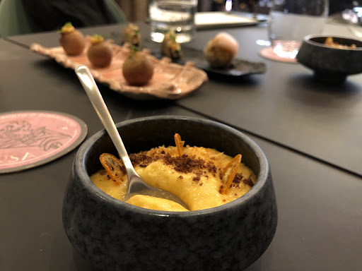 Read moreFuimos a cenar dos personas. Llamé para reservar y avisar que íbamos a comer menú degustación. El restaurante es bonito y peculiar, pero tiene unas mesas de plástico de chiringuito de playas las cuales no me parecen adecuadas para un menú degustación que cuesta 70 euros. Además las mesas muy juntas entre si, cuando buscas una experiencia de menú degustación buscas un poco de tranquilidad e intimidad, no tener una mesa al lado a medio metro. Estábamos mirando la carta de vinos y sin elegir ya nos sacaron los primeros entrantes. Creo que estos menús son para disfrutar y tomarlo con calma, y si no tienes nada para beber, esperar, porque empezar los aperitivos sin tener nada para beber no me parece nada profesonal. Lo primero que tienes que hacer a un cliente es darle algo de beber, aunque sea ofrece agua, pero algo de beber. La comida es correcta pero hay platos que les falta mejorar la elaboración: masas muy pesadas y poco delicadas, ahumados y sabores excesivos que predominan y enmascaran el resto de sabores.. la carne si que estaba buena, y el único postre muy simplón. No me parece un menú que cueste 70 euros, tanto por la comida como por ahí l servicio. Se que es un sitio que quieren dar un aire más informal pero un menú de 70 euros en una mesa de plástico de 1 metro me parece fuera de lugar. Se podían ver las manchas de grasa anteriores. La carta de vinos muy pobre, pocas alternativas y algo careros. Salí muy descontenta de la experiencia y con hambre, cosa que no me había pasado nunca en un menú degustación. Sin duda no volvería a este sitio a un menú...