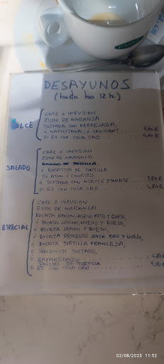 Read moreDejé de ir a esta cafetería porq dependiendo de quien te atendiera te cobraban diferente precio, un desayuno,café americano y pincho de tortilla, siempre igual, unas veces cobran por separado,otras no .hoy sábado 2 d agosto americano, pincho de tortilla, 4,90 .se lo digo a la camarera y me dice q como es americano me cobra por separado, el sábado anterior me cobró la otra camarera 3,80 , se lo digo y nada , por separado. Muro los precios de desayunos en la carta ,escrita a bolígrafo, lo más caro son 4,80 zumo , café y pincho o bocatita. Juzguen ustedes . Por supuesto...