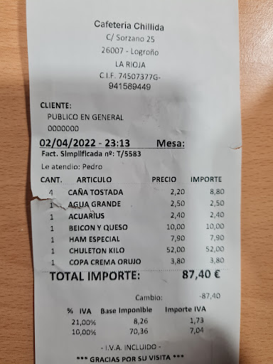 Para los adultos, menú "Chuletón" x 56€: Ensalada ilustrada (bien preparada y abundante) Chuletón de 1 kg. con pimientos del padrón y patatas fritas "cseras" (muy correcto todo) Botella de Crianza Rioja "Cueva de Lobos" (buen vino)
