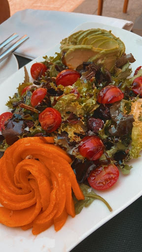 Pues en la que nos saca la ensalada de brotes tiernos, con arándanos, edamames, mango y aguacate con Módena (13€) en la que no había ni edamames, y solo cinco arándanos, ¡cinco! siendo los brotes tiernos mezclum Florette, nos dice que TAMPOCO hay carrilleras. Pedimos la carta de nuevo y pedimos risotto y preguntamos que son los fritos P73.