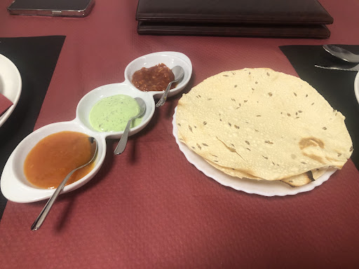 Nos sirvió la comida con el teléfono en la oreja mientras se quejaba de un Glovo o algo así y se dejó la mitad de la comanda dentro. No estaba en la sala y tuve que levantarme a pedirle el arroz después de 10 minutos sin el mientras la comida se enfriaba. Por otro lado, aloo Chana, daal tadka y verduras con curry son exactamente la misma salsa y saben igual. Un aloo Chana y unas verduras con la misma salsa madrás, bueno puede pasar por valido, pero unas lentejas con salsa madrás no son un tadka daal. Da igual como me lo quieran vender, saben de sobra que esto no es así. Los entrantes no estaban mal, quizá sean caseros, congelados y descongelados a la hora de servirlos antes de freír, lo entiendo. La ración de arroz blanco 5.50, una barbaridad, al menos no era pequeña. El pan estaba pasable, bastante quemado en una parte.