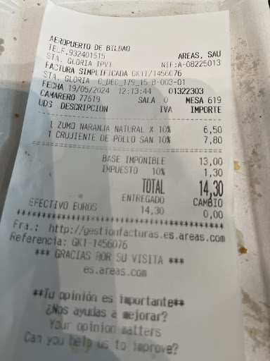 La comida bien...voy a opinar lo q para mí siempre es importante y es el servicios al cliente...y hoy tuve una incidencia con mi vuelo y el trato recibido por parte de la chica de la caja muy malo, entiendo los niveles de stress que pueden manejar en estos sitios pero como clientes merecemos también. Una sonrisa mínimo o amabilidad al atenderte...no es más! Ojalá tengan en cuenta las opiniones para mejorar el servicio que de parte de los camareros no tengo nada que decir, la comida estupenda pero a veces una persona o una actitud puede echar a perder el trabajo y esfuerzo...