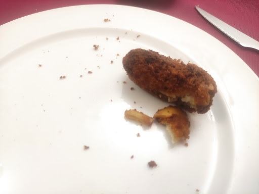 Sin embargo, los entrantes que fueron llegando a lo largo de más de hora y media, fueron de una calidad que dejaba mucho que desear. Todo lo que pedimos tenía pinta, textura y sabor de ser un congelado de mala calidad pasado por freidora. En casa la bolsa del congelado del super, sale mejor. Las croquetas con trozos negros quemados y algo pegado al rebozado (foto).