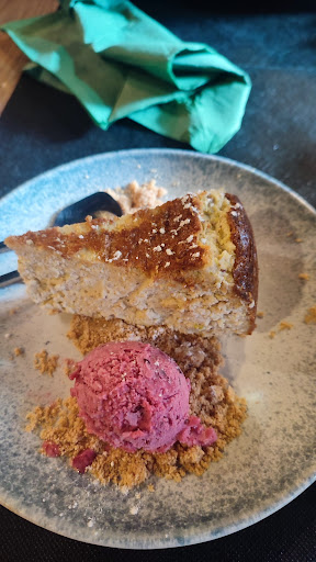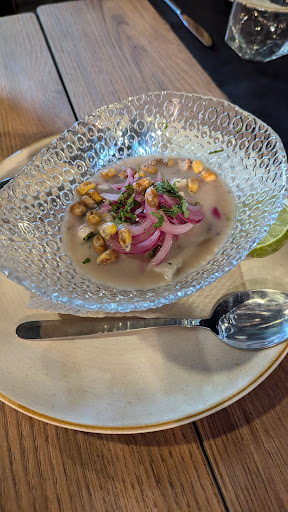 Pedimos varios platos, todos muy interesantes. Comenzamos con una marinera rosa, un plato interesante pero que le faltaba un poco de intensidad. Estaba bueno, pero no era wow. Luego, pan brioche con anchoas y salsa huancaina, muy interesante pero que probablemente podría mejorarse con anchoas más grandes y menos salsa. Croquetas de pulpo y croqueta de jamón, las primeras extremadamente buenas, las segundas también buenas, pero inferiores a las de pulpo. Aun así, muy sabrosas. Como platos principales, calamares a la andaluza sucios, muy particulares pero extremadamente buenos, acompañados de una salsa fresca. Finalmente, pulpo roquero con vinagreta de aceitunas, un plato sencillo pero muy bien ejecutado con un pulpo bien trabajado. Y para terminar, la tarta de pistacho con helado de frutos rojos, divina. La tarta estaba realmente buena y la porción era generosa. Terminamos con dos cafés, también con un regusto interesante.