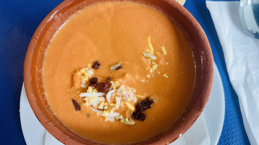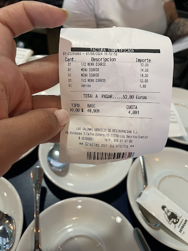 Driven past many times and wondered why people would choose to eat on an industrial estate! However, when the three places I would usually go to in Palmones were shut, I looked at the reviews for Las Salinas and thought I'd give it a go. It seems very popular, but we were shown to a table where a menu del dia showed a very good choice of dishes, either meaty, fishy or even veggie for âŹ13.50 including bread, drink and postre. Portions were big. Highlights for me were the seafood rice starter and the pudin for dessert.