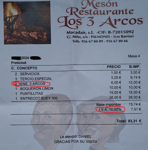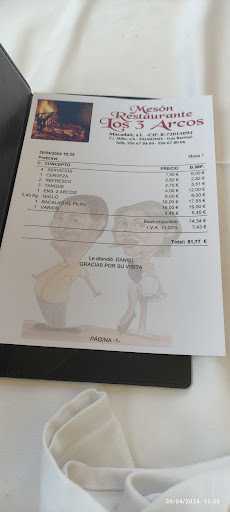 Read moreHemos comido una ensalada los tres arcos, que son cogollos (en 6 cuartos) con maíz, atún, pimientos rojos y palmito, que no destaca mucho para llevar el nombre del mesón y tenía algún habitante (insecto) ademas de tener restos de tierra, como si no estuviera lavada adecuadamente, no es agradable pero puede pasar. Los espárragos no sabían a nada y el maíz tampoco. Pedimos nuggets de pollo, que entendimos eran congelados, y no aportan mucho, las patatas si eran caseras y estaban buenas. El gallo rebozado estaba muy bueno, mejor que los nuggets para los niños y no tan niños. El bacalao al pil pil estaba muy bueno también, lo sirven en cazuelita de barro y la salsa estaba rica. Pusieron tapa solo de patatas con salsa de alioli con perejil y col (si te gusta el ajo muy buenas), echamos de menos aceitunas o algo más. Incluyeron 5 euros de varios, que no entendimos a qué se debía (no pregunté porque no eché cuentas en ese momento y por la tapa de papas me parece excesivo pues ni las aceitunas nos pusieron). El personal es muy agradable y el pescado está bueno, pero por los detalles que indico no puedo darle mejor valoración, cosa que por el personal me sabe mal, pero es nuestra opinión. Relación calidad precio elevada,...