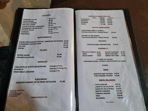 Read moreOn a one way street with no parking except down hill, the street before you would have turn left to get to the entrance. It is walkable from the pedestrian zone. They have indoor and garden seating. We had the Queso Asado (3 sections of cheese grilled w/ 3 different flavored toppings) with a roll and 2 Croqueta Argentina (beef filled) as appetizers. I had the larger serving (enough for 2) of El Churrasco (slices of medium rare steak which you cook to your liking on a table top grill plate) and Papas Arrugadas (small whole potatoes w salt crust.) My wife had Ravioli. For desert we had Polvito Canario (translates as Canarian Powder, but it's not powdery.) Try it you'll love it. Very rich. See photo. Everything was delicious. Topped it all off with a cappuchino and Cortado. The bill came to 71,70 Euro. And we got free shot of somthing Canarian close to Baillys. P.S. If the fire under your grill goes out, just ask for another. The wait staff were very helpful and friendly. Our waiter spoke english. The menu was in english but needs editing. Wheelchair accessible...
