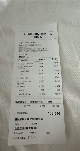Read moreThis place is way overpriced compared to other places (usually, restaurants), we have eaten in here on Tenerife + overall the experience was not reflecting the prices. There was a cockroach on the wall next to us (and we had already ordered, so we had to move tables). There were two menus - one on the wall, and another one they brought to us separately which didn’t have prices on it, and we wrongly assumed they would be in the same range as prices on the wall’s menu. 20€ for puntas de solomillo de ternera is not reasonable at all (dish with a lot of french fries, some meat on top of it and sauces). Also, they charged for the bread and sauces that go with it even though we didn’t order it. You can eat in much nicer places/with better food and service for a lower...