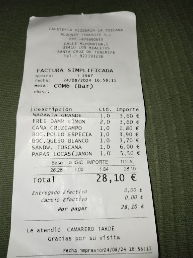 El lugar está limpio y el chico que nos atendió fue muy muy amable. Es una pizzería pero solo para la cena, no en horario de comida. No habían pizzas. No me avisaron nada de que fuera por fiestas simplemente me dijo el chico que la cocina era para la cena y lo que entendí es que era así siempre. El tiempo de espera demasiado para haber solo 4 mesas y 4 personas trabajando. Las papas les faltaba fuego, blanditas y congeladas. La hamburguesa estaba muy rica. El bocadillo de mechada, la mechada y el pan fríos, no sé si se les enfriaron por esperar a terminar la hamburguesa, pero la mechada estaba fría de la nevera. Los precios de la carta en papel no corresponden con lo cobrado. Me dijo la chica que creía que sí eran iguales (pero no es así) pero que igualmente en la carta ponía: "precios sujetos a modificaciones". No lo comprobé pero en cualquier caso, no me lo advirtieron previamente y entiendo que la carta de cualquier sitio debe estar actualizada. Cada cosa tenía 20 céntimos más que en la carta. Dos personas; papas locas pequeñas, hamburguesa especial y bocadillo de mechada, 16,80 En ningún momento me puse de mal humor, simplemente le comenté a la chica sobre los precios distintos en la carta y en la cuenta y la respuesta de "sujetos a modificaciones" que me dijo que ponía en la carta, me resultó surrealista y creo que es algo que no tiene ni pies ni cabeza, de ahí mi cara de asombro y aún así pagué amablemente, di las gracias y me fui. Creo que es algo que no debería suceder, así se lo dije en persona y así lo escribí aquí y es lógico que la cara de una persona cambie a malestar porque no corresponde que esto suceda ni en fiestas ni en no fiestas. Creo que he aportado varios aspectos positivos en el comentario pero desgraciadamente en nuestra visita fueron más los negativos que los positivos...