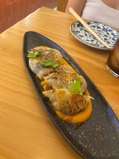 ⁃ 🥟🥩 Gyozas de morcilla de wagyu y boletus. Se trataba de unas gyozas crujientes con un ketchup de ajo negro, muy potente de sabor. ⁃ 🫔🐟🍗 Flamenquín roll. Flamenquín de anguila ahumada, setas y tocino ibérico. Muy jugoso por dentro, y el sabor increíble. Venía acompañado de dos salsas distintas. ⁃ 🥟🥩 Gyozas de rabo de toro. Sin duda uno de nuestros platos favoritos. Espectacular tanto el relleno con la salsa, como la propia masa de las gyozas. Muy recomendable. ⁃ 🍣🥩 Maki sushi crujiente de steak tartar de angus . Otros de nuestros platos favoritos. Muy buena combinación del maki con el steak. Quizá la carne debería haber estado cortada un poco más fina, pero sin duda un plato que hay que probar. ⁃ 🍞🥃 Torrija caramelizada con sake . La joya de la corona. Si vienes a este sitio, hay que probar la torrija. Una de las más cremosas que hemos probado.