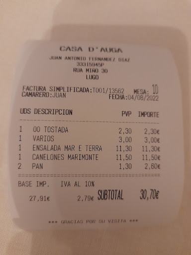 Read moreI have friends from lugo that I now call family 👪 the last 30 years I'm from ireland 🇮🇪 and they say that the food capital is kinsale co cork wich is very close to where I live. But I have to say the food service etc goes above and beyond!!. Take a bow Casa D'auga thank you for a amazing...