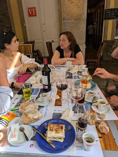 Tourists, run away. One of the waiters laughs and kisses the regular customers, the other waiter doesn't seem to pay any attention to what's going on and the tourist tables are virtually ignored. We voiced our dissatisfaction because some of the meat from our churrasco was burnt: no apology or commercial gesture was forthcoming. You are charged 0.20 for a small dab of mayo and the evening meal (identical to the pilgrim menu displayed for lunch) costs twice as much. Contrary to what the menu suggests, the meat comes with chips, but they charged us 3...