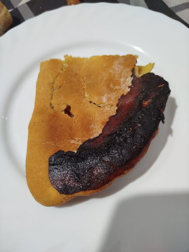 Read moreLas peores empanadillas que he probado en toda mi vida, insípidas, apenas por no decir casi nada de mejunje y lo que apenas llevaba, trozos enteros de pechuga de pollo como la suela de un zapato y lo otro ni sé lo que era, supongo que cebolla a destajo y gorda gorda.Ademas quemada y aunque no se aprecia en las fotos, pegado a lo quemado un bichito pequeño, así que suficiente para no volver jamás ni tampoco recomendar.Mejor id a cualquier otro lado porqué peor que esto no...