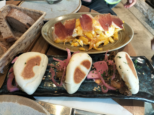 Fuimos de casualidad a este mesón en nuestra visita a Lugo. Vimos las buenas opiniones y nos animamos a entrar. Es un local muy bien decorado con gran terraza. En cuanto a nuestra experiencia, la camarera joven no fue especialmente simpática con nosotros. Al principio, pedimos un par de bebidas y le pedimos la carta. Empezamos a ver que a todas las mesas les ponían una tapa, así que se lo dijimos. La camarera nos dijo que la tapa era si tomabas algo (ya habíamos pedido bebida y no íbamos a comer de menú del día) y que iba a preguntar en cocina. Luego, vinieron los platos: huevos rotos (estaban buenos) y panes bao (una delicia, sinceramente). Tras ello, pedimos dos bebidas más y siguió sin traernos la primera tapa que le habíamos pedido: decía que la cocina estaba muy ocupada y que no podían sacar tapas (a los 5/10 minutos como mucho sacaron más tapas para otras mesas de la terraza). Tras un rato, se la volvimos a pedir y finalmente nos la trajo, pero no sin antes mirarnos bastante mal. Vimos un detalle bastante feo que no nos trajeran la tapa (si a todo el mundo se la sacan) y que nos dieran largas con ese desprecio... Recomendable por su comida y el ambiente. Sin embargo, nuestra experiencia con la camarera no...