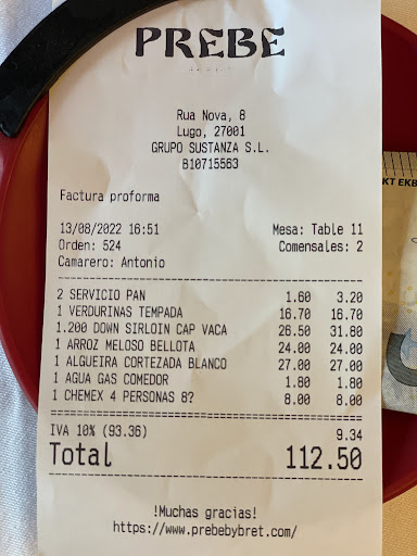 Read moreOs cuento mi experiencia y espero que os sirva para llevar todo más claro cuando vayáis. Cuando reservé, la verdad es que no me paré a leer mucho las reseñas, me fijé en las fotos de los platos y con eso me quedé. Al llegar al restaurante nos dejan las cartas y nos explican todo lo que tienen fuera de ella. Todo se puede compartir. Todo lo que tenían eran pescados y mariscos de primera a unos precios que no encajaban en lo que teníamos pensado gastar y ni rastro de esos platos que me conquistaron. Ya sentados no quedó otra que elegir. Hay dos opciones para comer allí . Una en lo que llaman bodega que está en la planta baja. Mesas y sillas de madera con mantelillos de papel con una pequeña carta en la que venían aquellos platos que comentaba yo de las fotos. Creo que ,cuando llamas para reservar ,deberían informar de esto y a mi desde luego no me lo dijeron. También sugiero que lo expliquen en su Web. Como dije comimos en la planta de arriba con mantel de tela y muy buen servicio. La comida estaba buena pero me ha parecido muy caro. No se nos habló en ningún momento de menú de degustación y en la carta no lo vi. Una mesa cerca de la nuestra lo estaba tomando. Os lo recomiendo si os apetece comer, buen pescado y marisco y estáis dispuestos a pagar como mínimo 70 euros por persona. De la carne no puedo opinar porque no la probamos. Como veis en la factura pedimos un cabracho frito para compartir, un pulpo hecho a la plancha con puré de patata que no me dijo mucho, un tartar de atún que si me gustó bastante. La terrina de leitón y el galo celta ricos pero no sorprendentes. Pedimos todo esto porque nos lo aconsejó el camarero pero nos sobraba un plato, por no dejarlo no nos quedó hueco para el postre que tenía muy...