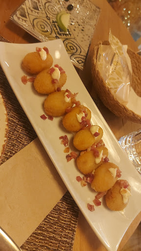 Fuimos por las reseñas tan buenas que tiene, pero para nada con la realidad. No es muy grande el restaurante y apenas había gente. Nos pusieron a los 4 que fuimos en la puerta y pasamos un frío…. Pedimos tapas para probar y menos mal! Porque todo sabía a lo mismo! A nada! Los pimientos de padrón, no son de padrón y estaban apenas fritos, un lado crudos y otro lado un apenas ni tostado. Súper duros, como si me como un pimiento crudo vamos! Unos tamaños de pimiento que no tienen nada que ver con los de padrón, que no digo que tengan que ser de ahí…. Pero parecían más pimientos de ensalada que otra cosa y sin apenas sal. Lo único que estaba más o menos bueno la morcilla. Luego la mini hamburguesa para vegetarianos pésima, la peor que he comido en mi vida, y con la misma salsa que la morcilla. El surtido de croquetas ni queremos recordarlas, solo eran de dos tipos y sabían todas igual, a nada y a queso. El pulpo y los calamaritos sabían a lo mismo, a nada! Ha sido de las peores experiencias, muy bonitas las tapas y los platos en fotos pero lo peor en sabor, no poder disfrutar saboreando sino llenándonos el estómago y encima nada barato para una comida rápida y sin sabor. Decir que todas las tapas llegaron al mismo momento y tardaron menos de 5 minutos en servirnos desde que pedimos, vamos que no era comida cocinada en el momento. Queríamos pedir la cuenta y la camarera fumándose un cigarro fuera, así que tuvimos que esperar a que terminase de fumar para que nos atendiera. Si no quieres tener una experiencia gastronómica buena no te recomiendo este sitio. Termino comentando el malestar estomacal que 3 de nosotros tuvimos el resto del día, claro que nuestro cuarto acompañante apenas comió. Calidad precio= muy caro No lo recomiendo.