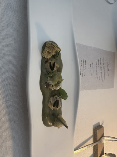 What made our experience even worse was the poor communication from the staff. They struggled to provide even basic explanations of each dish in English, often listing ingredients without any mention of preparation or concept. For example, the first dish in our course—titled “Cream, oyster, and seaweed” (ironically where we suspect the virus came from)—was presented without context or explanation. The server couldn’t elaborate on how it was made, and eating it felt like slurping an oyster out of a salty swamp—made worse by the aggressively seasoned cream.