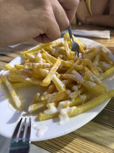 Las patatas fritas con bacon y queso altamente recomendables ya que parecen naturales y no congeladas. Tuvimos que preguntarle al servicio si eran naturales porque su textura nos hacía dudar, las patatas no eran todas iguales de tamaño y estaban blandas en vez de crujientes como las congeladas.