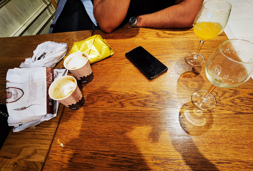 Hi. We didn't have a pleasant experience at all. 1st we checked for available tables there were none and looked for a waiter and no one came.. Okay.. Moving on we got in line to get food for takaway and if a spot opened up to sit down. That on one hand the line was where the door was going straight 5 min later the line hadn't moved and 4 more people made a new line. We finally got to order and asked for a table if we should wait or how it worked. The girl at the counter said no english, you finish? We haven't even ordered, how are we finished with our order? Anyway with a lot of pointing we ordered and we didn't even see how much we needed to pay as the number was not displaying anywhere and she said the amount in spanish. Just as we were paying a table opened up and my husband went to get it. We sit down all good finally and starving and a waiter comes and basically starts yelling at us! His eyes looked like they will come out.. We told him we waited for a table for over 20 min and finally got on a line to get our food. He didn't know english we couldn't understand eachother. He explained something like - we can't eat here because we have gotten our food for takeaway and we have to order food to sit down. Okay we ordered orange juice, he brought it and we started eating. Again same story as above he started yelling at us that the table was coffee and pointed at the bakery and said food. I offered him google translate and he said 'understand me' and stormed off. We were starving, we had bad CS and finally we paind the bill for our juice and he was covering above us until we paid. The moment the money was out of my husbands wallet he grabbed it and took off to the cash desk! I am sorry but that is too much! The coffee was not good at all and the croassants weren't that fresh.